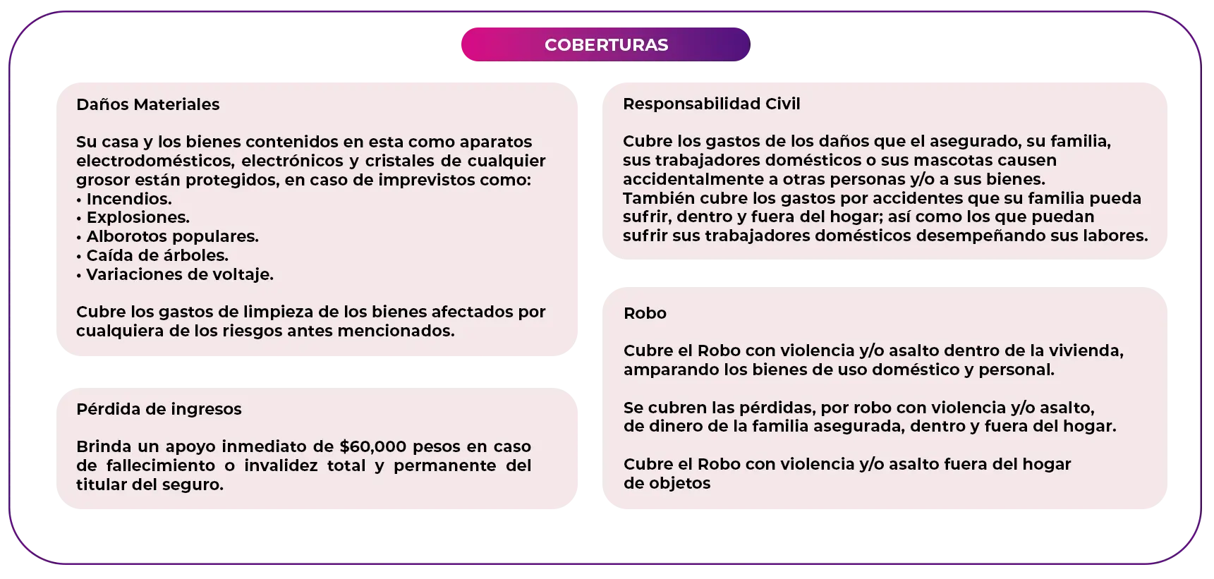 PROTEGE TU CASA Y TODO LO QUE AMAS DENTRO DE ELLA. CUBRE DAÑOS, ROBO, RESPONSABILIDAD CIVIL, FENÓMENOS NATURALES Y OFRECE ASISTENCIA LAS 24 HORAS PARA QUE SIEMPRE TE SIENTAS TRANQUILO.